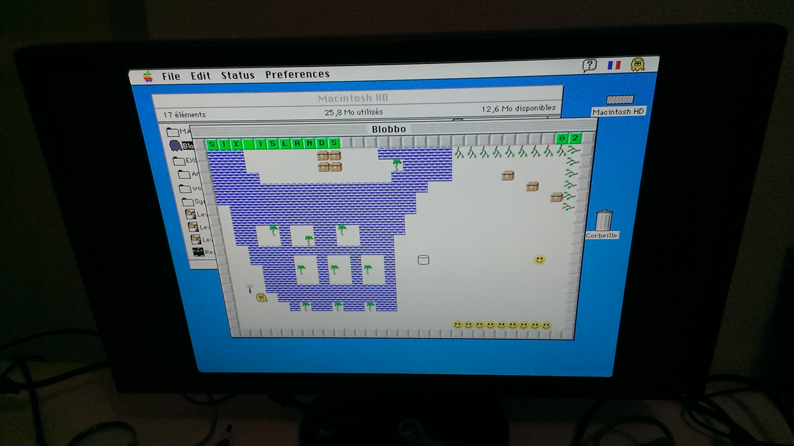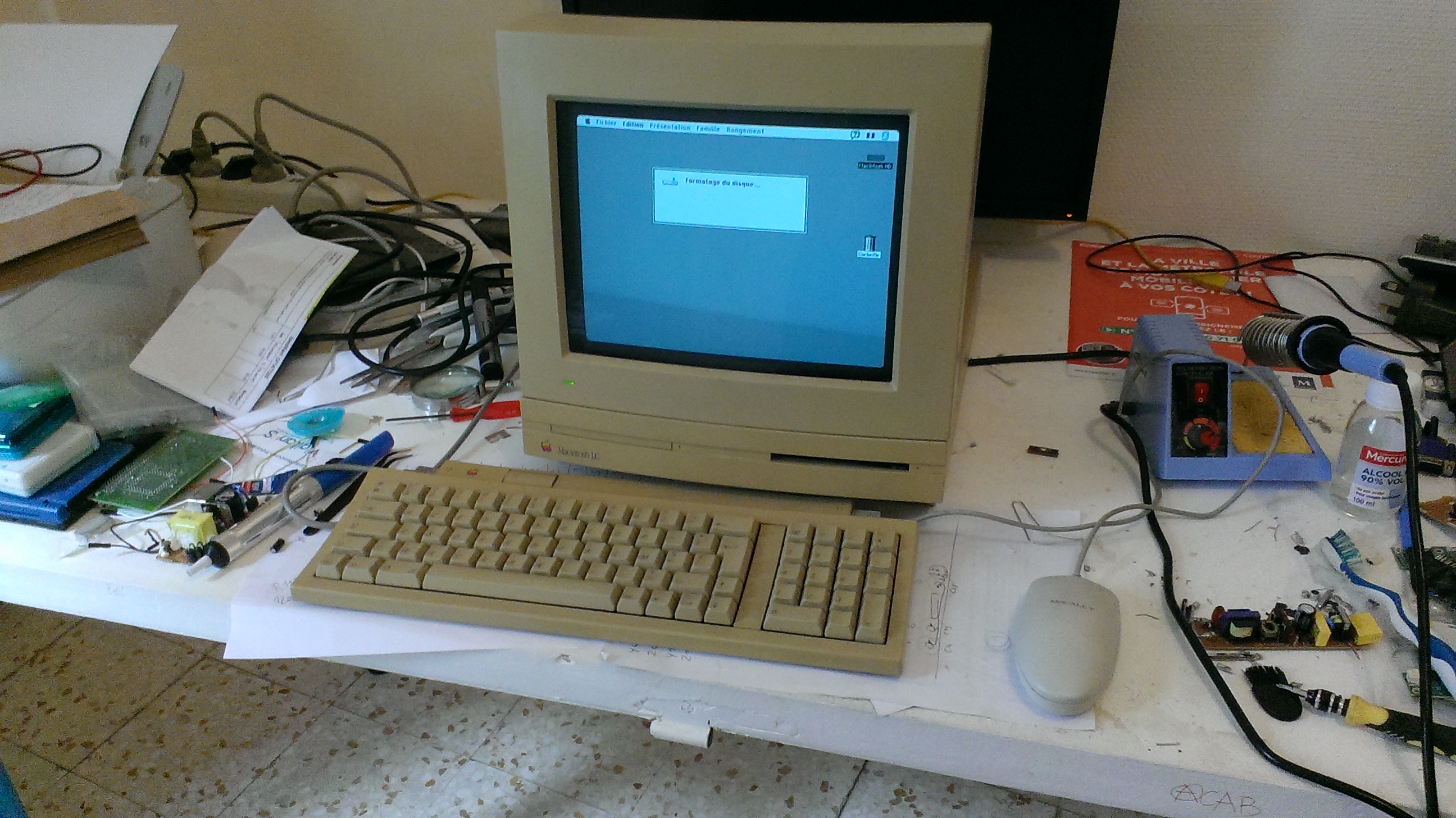 so, anyway. the facts. a while ago I was able to salvage a couple modern computers: • Packard Bell PC from the mid-1990s • Macintosh LC in this post I will focus on the latter, because while the PC is working more or less smoothly, the Mac gave me one hell of a ride. it came complete with mouse, keyboard and matching monitor. while the monitor did turn on, the Mac itself gave no sign of life. opening it up, things looked atleast decent. it atleast hadn't been Maxell-bombed, and the old PRAM battery wasn't leaking (yet). however, it did have leaking capacitors, the audio chip even found itself covered in cap gunk somehow. the power supply had leaking caps too. I measured the voltages out of it, the 5V, 12V and -5V rails measured respectively at 2V, 1V and -3V. no wonder why the thing wouldn't turn on... however I wanted to see if the thing was worth attempting to fix. I borrowed the power supply from the Packard Bell, which I knew was working fine, and had the required voltages. by using staples and some trickery, I was able to extract the metal contacts from the ATX connector with no damage, and connect them directly to the power pins on the Mac's motherboard. that ghetto setup revealed that the Mac was mostly working fine, minus having no audio (and a nearly dead HDD). after a while, the speaker started screeching at me, which is apparently caused by cap gunk. in the meantime I stuck a piece of paper between the speaker contacts. also, the original monitor is monochrome, which is a bit of a disappointment to me. so, with my meagre electronics skills, would I be able to fix it up? I apparently thought so, and started ordering replacement capacitors and shit... I started the work with the Mac's power supply. removing the old crapoed capacitors, cleaning up the gunk where they used to be, and putting new ones in. pretty standard shit. except the power supply didn't work right after the recapping, so it was going to need more attention. in the meantime, I still had the ATX power supply set up as a replacement, so I put it aside... I moved on to the motherboard. using the 'twist back and forth' method, I was able to remove the old capacitors with no damage. I removed the leftover cap legs from the solder pads, did some cleanup, and attempted soldering in new caps. all fine and dandy. except it didn't work. it was soul-crushing to watch the thing sit on a black screen and do nothing visible. I tried cleaning the motherboard harder, checking my solder joints (some of which were bad), even redoing all my soldering with a different technique, all to no avail. well, at one point it did boot, but it was unstable. but atleast it wasn't entirely dead I guess... I figured I needed to redo my work the right way. ordered some flux, desoldering braid, etc... I desoldered my capacitors again. ended up with some damage to a couple pads, but nothing that wasn't quickly taken care of. I made sure all the traces were good, cleaned up the solder pads with solder wick, resoldered the caps with generous amounts of flux. all seemed good this time. this time the motherboard was working reliably again. it still didn't have sound, but it was atleast back to being usable. the power supply, after some cleanup, seemed to work... mostly. sometimes it wouldn't start, but when it did, it was rock solid, outputted correct voltages, etc... after a while, the issue seemed to mostly resolve itself, so I put the Mac back together, and put the ATX power supply back into its computer. all seemed to be good again? I was in for the original experience of playing Blobbo Lite and some other fun games in the good ol' way, so the lack of audio bothered me. I wanted to see if I could fix that, so I grabbed some old Mac schematics. they don't have schematics for the LC, but they do for the LC II, and most of it is identical to the LC, including the audio circuitry. so I started investigating it. the DFAC (audio chip) is fed 8V power by a 78L08 voltage regulator. all fine and dandy. except the voltages I measured on its input and output pins weren't looking good. the input was around 8V and the output was 7V. so something was up there. the 78L08 input is connected to the 12V power rail through a resistor, and the output goes to the DFAC. both connections worked fine. however, something was up with the ground -- the 78L08's ground was connected to the DFAC's ground, but there was no connection to the system ground, which seemed wrong. further inspection revealed that this affected pretty much the entire audio circuitry, and also the ground plane to which the shrouds of the I/O connectors were soldered -- those were all interconnected, but had no connection to the system ground. I couldn't find where the break occured, so I ran a bodge wire between the two grounds to reunite them back. that didn't fix the audio output, it was only outputting some barely audible garbage at best, but atleast it was getting proper power now -- the 78L08 input measured at 12V and the output at 8V, so atleast that was fixed. digging more into it, I looked at the audio output circuitry. in particular, the DFAC's audio output line goes through a circuit with a bunch of passives, then to pin 4 of the amplifier at UC9. so I started checking continuity, which was a bit of a pain as the trace goes to the other side of the board where most of the small passives are. those also have different numbers than those in the LCII schematics, but you can still make out the circuit. anyway, all that circuitry was fine, up to the point where it went back to the top of the board to connect to UC9. the small trace connecting the via to the chip was broken. all the other traces running from UC9 were fine, but this particular one was not. the trace goes under UC9. I don't have a hot air station, so I wasn't going to attempt desoldering it... I ran a tiny bodge wire. I gave it a try and... bong! so, having fixed the audio output, things were looking pretty good... ...until the d