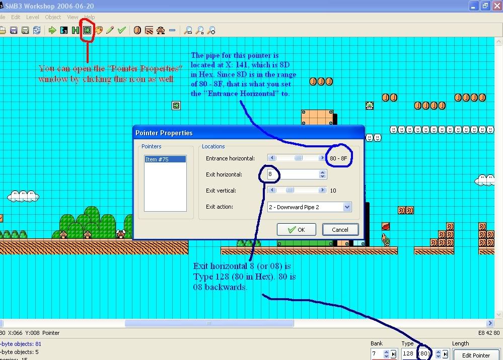 First place the 3-byte pipe/door to be entered, and then place the pointer for it immediately after (3-byte, Bank 7). With the pointer selected, press Enter to bring up the window to edit its properties. For more specific details, please refer to this post. For a visual, please click here. (Sorry in advance if it's blurry; as you can tell from the image name, it's from a while ago and I don't really have time to make something new up right now, so hopefully it'll do.)Originally posted by Blaarg When I get to the Boom-Boom fight, there is a Boom-Boom UNDER the floor, though there is no Boom-Boom showing under the floor in the editor. So the Boom-Boom falls and the ?BALL appears even though the original Boom-Boom is still alive. Is this a glitch, or....