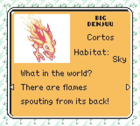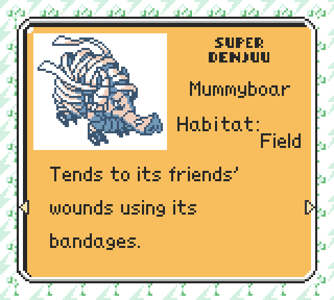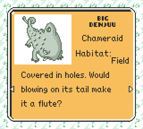 ![]() Maybe you've heard of PokΓ©mon Diamond and Jade instead. Over at Tulunk Village we've been working on a proper English translation patch for nearly ten years. ![]() From manual hex editing and exchanging IPS patches, we've reached the point where we have a work-in-progress disassembly with the English patch built on top of it. It's elegant. Recently, we (or rather, others - I can't claim much credit!) have been making a lot of progress, with new versions of the patch being released on a monthly schedule. Just yesterday, version 117 was released. Version 117 features a redesigned Field Guide capable of displaying 3 lines and pagination - and translations to make use of it! ![]() It brings the ability to automatically condense strings where they don't fit... ![]() and a sweet new splash screen. ![]() And many more changes. You can read the full changelog for this release on kmeisthax's blog. (really, do! It's well written.) If you're interested in Telefang, check out telefang.net - we have a wiki, a forum, and a Discord! If there is interest, I'll be posting news about the patch here, along with other possible tidbits. ____________________