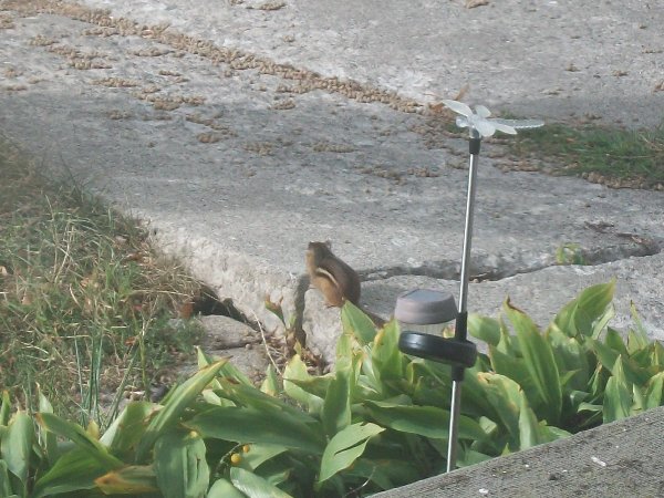 Our driveway's concrete has been pushed up by a nearby tree's roots, leaving an opening that allowed a Chipmunk to move in under there.