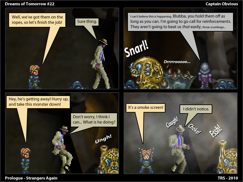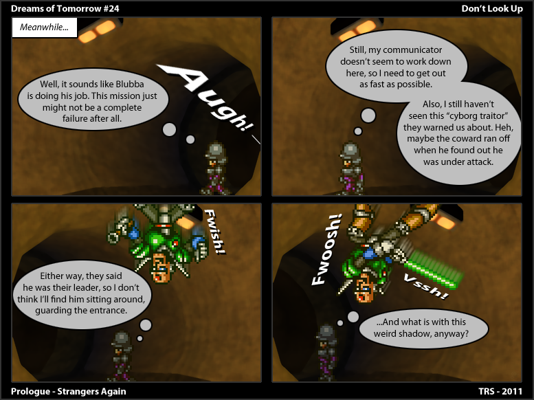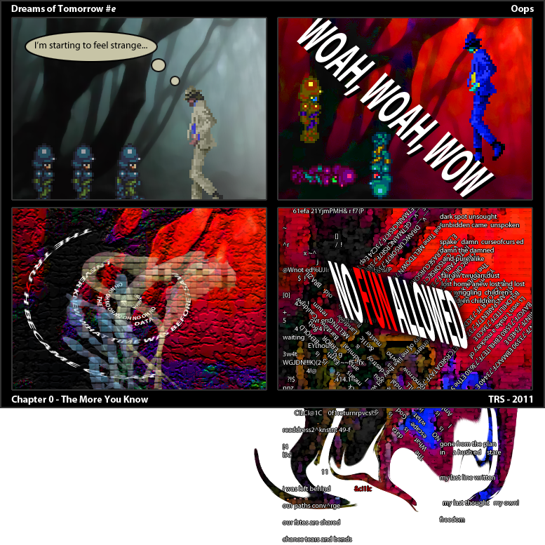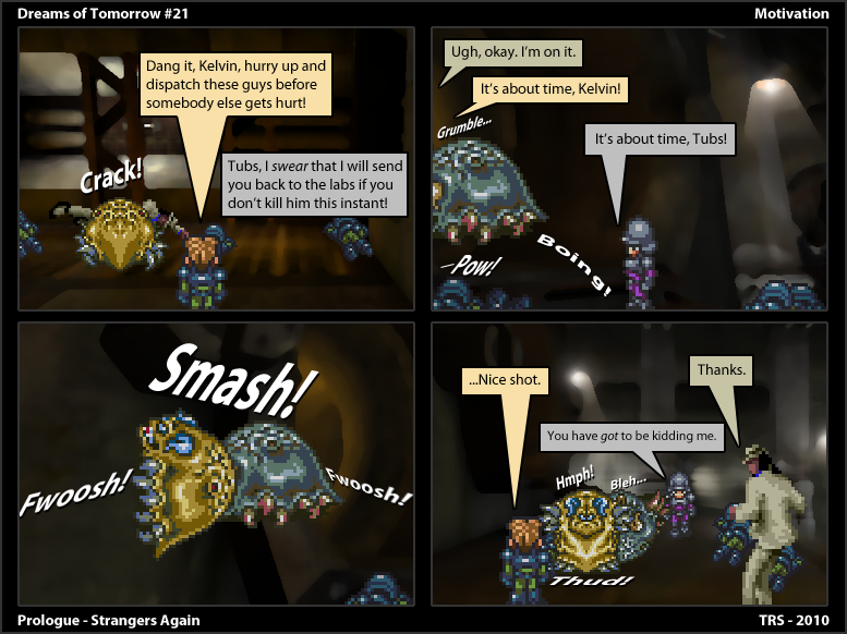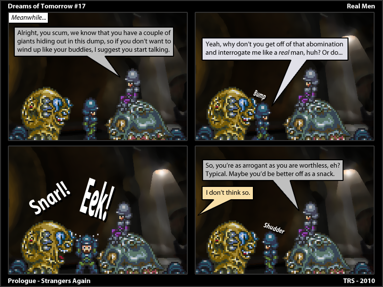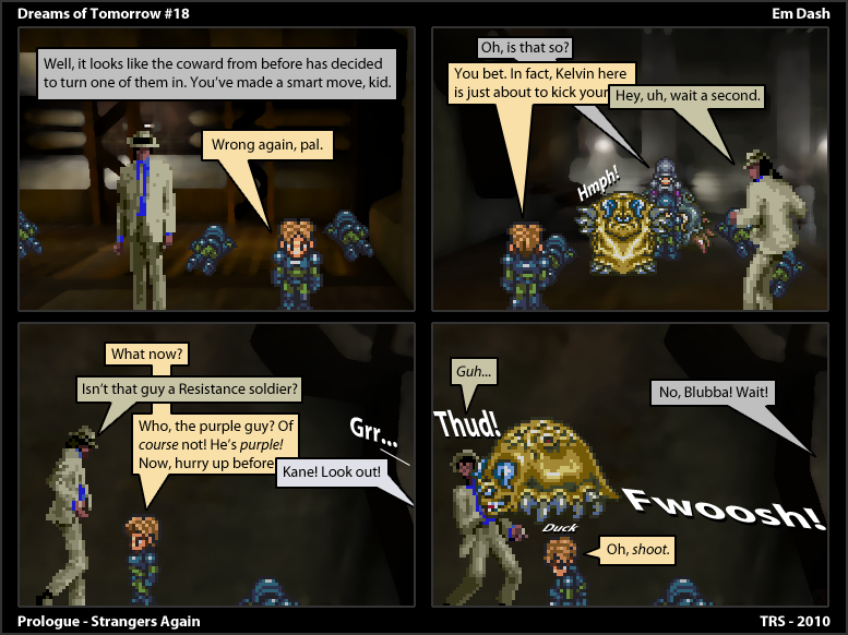 | Database: Thanks for the support; it certainly helps my motivation. Anyway, in between doing homework, donating blood, and reading, uh, reference material, I haven't had much time to work on this. Despite the delay, though, all of the old strips have the new font now. As such, I can focus on new ones, like this: ![]() I imagine mutants that large have to snack quite often. Tune in next time to see how our heroes handle this situation! |