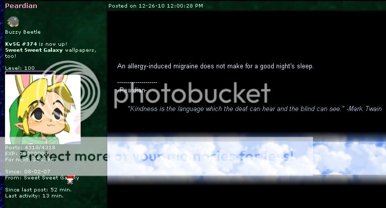 Taryn Passed away. Thanks for being a part of us, even if it wasn't always on the best of terms. 1987-2014 Level: 204 ![]() Posts: 10902/14742 EXP: 121586588 For next: 1763230 Since: 09-01-09 From: Seattle Since last post: 10.1 years Last activity: 9.7 years |