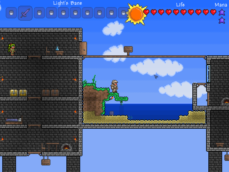 | The nerfed Skeletron isn't as nerfed as I thought he would be. He still puts up a fight if you're not in magma armor, meaning you can just go straight to him immediately after felling Eater of Worlds (once. Just fight Eye twice for the demonite.) Unbuffed he'll keep you on your toes but popping a regeneration potion + ironskin would make that fight fairly easy. I'm okay with this considering the kinds of things you find in the dungeon anyway. Other thoughts I have about this update: - HELLBATS ![]() - the glittering gold/silver/iron/copper bricks are swanky. Though the walls need to be glittery for maximal swank. ![]() - GOLD CHESTS ![]() - The guide's actually helpful, now. There's also the Guide Voodoo Doll - The inability to flood hell really bums me out. Really. |
