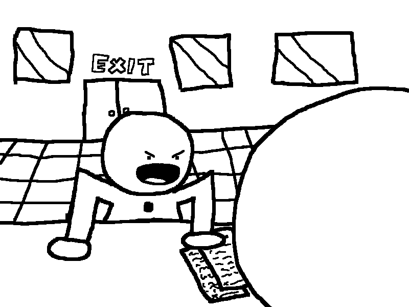 Suddenly comprehending the potential danger of this situation, you start to feel very uncomfortable.![]() You aren't very good at hiding it. Thinking quickly, you overcome your sudden fear and break into a silly jig to try and calm him down. ![]() While doing so, you politely ask if you can register and/or help him with anything. You finish your dance, and your plan seems to have worked. ![]() The large person behind the desk politely informs you that he does not need help, but he is willing to register you if you sign the papers in front of him. You glance over at the papers and attempt to read them. ![]() You do not succeed. |