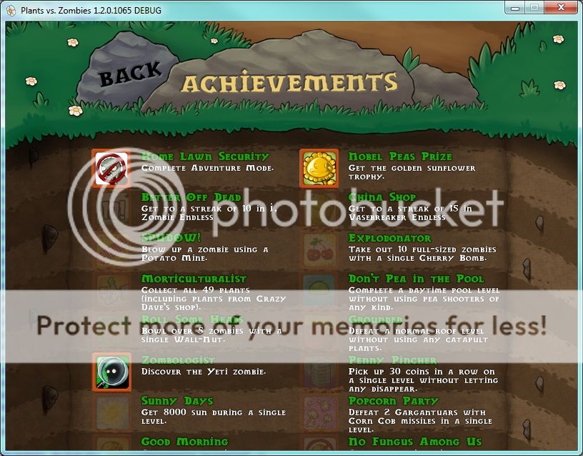 The only "notable" thing is that the title bar says "Plants vs. Zombies 1.2.0.1065 DEBUG"