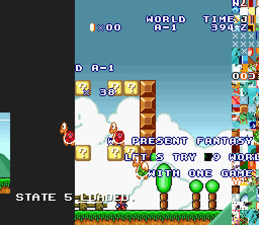 When loading a savestate that I saved during the world A-1 intro graphic, various variations on this screen show up for a single frame: