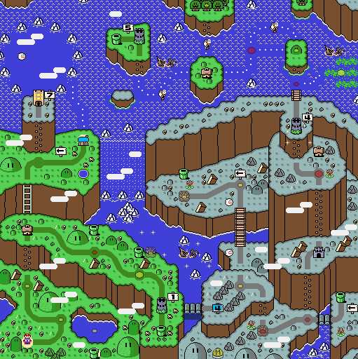 | Excellent overworld, S.N.N. Everything is detailed perfectly. It's nice to see you working very hard on every aspect of this hack. The only thing that seems a bit out of place, and I really mean a bit, is that bridge right above the 4th castle. It appears to lead into the water to that red dot level, is that correct? It just seems to be out of perspective a bit, since the other bridge in the screen goes from the top of one land mass to another. Sorry if I misunderstood the purpose of that, correct me if I'm wrong. That's literally the only problem I can find. Great job! |